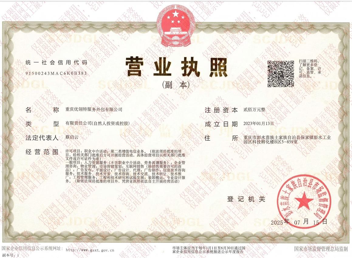 重慶優(yōu)翎特服務(wù)外包有限公司成立于2023年1月13日,注冊(cè)資金200萬元,注冊(cè)地址位于重慶市彭水苗族土家族自治縣保家鎮(zhèn)彭水工業(yè)園區(qū)科技孵化樓B區(qū)5-859室,法定代表人:蔡啟云。