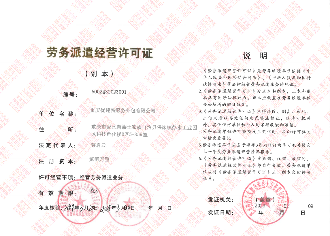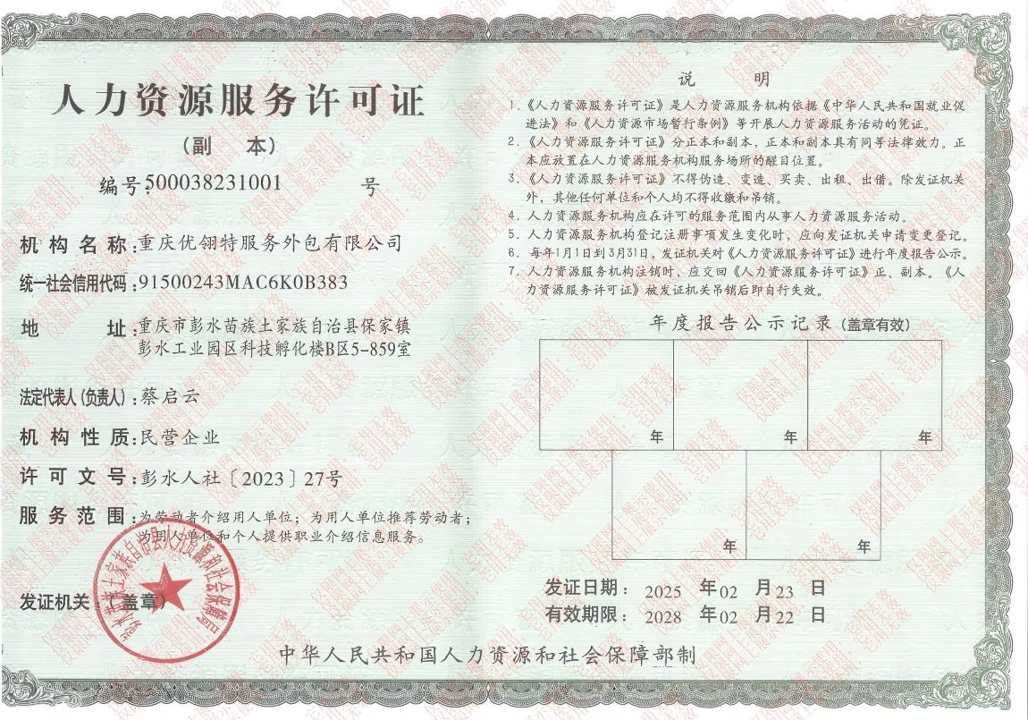 我公司旗下的招聘網(wǎng)站“老黃牛用工服務(wù)管理平臺(tái)”是專注重慶地區(qū)的職業(yè)發(fā)展平臺(tái),為重慶本地用戶的整個(gè)職業(yè)生涯提供相關(guān)職業(yè)及發(fā)展機(jī)會(huì)。我公司已取得重慶市渝中區(qū)人力資源和社保保障局頒發(fā)發(fā)《人力資源服務(wù)許可證》、《勞務(wù)派遣經(jīng)營許可證》。
